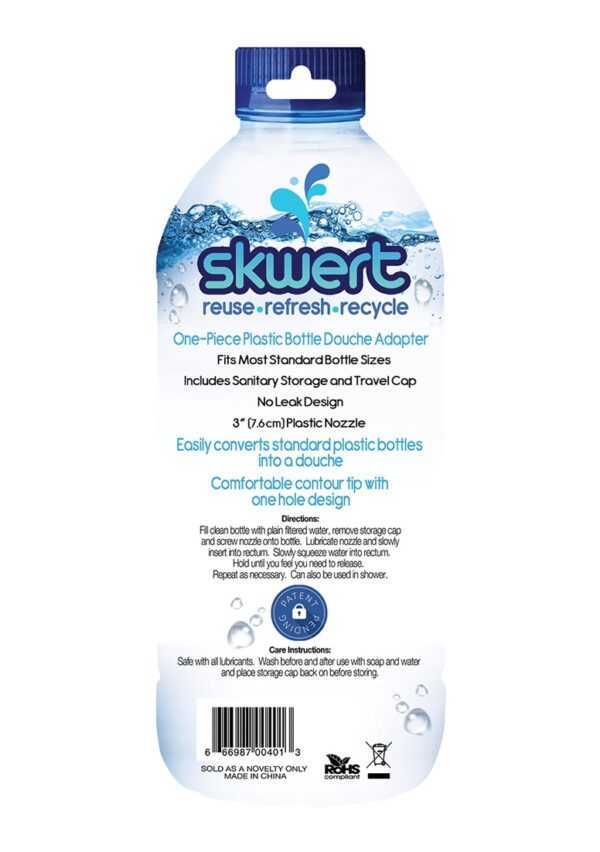 Skwert – Enema – 1 PieceDeze altijd en overal klysma-adapter is speciaal gemaakt voor die ontmoetingen waarbij je geen tijd hebt om je volledig voor te bereiden. Het plastic mondstuk met schroefdraad uit een stuk past op de meeste waterflessen van standaardformaat. Dit onmisbare apparaat is ontworpen om in je zak, tas of rugzak te passen, voor een schoonmaakbeurt onderweg voor die ongelegen momenten die soms opduiken. Vergeet het vinden van een douche, zoek gewoon een fles water, schroef hem vast en je bent klaar om te gaan! Ideaal voor op reis, onderweg en dagelijks gebruik. U kunt er zeker van zijn dat de Skwert u keer op keer door onverwachte kansen zal helpen. Het 2,5-inch mondstuk is gemaakt van glad plastic met een grote schroefdraadfitting voor een lekvrije pasvorm. het heeft een comfortabele contourtip met een ontwerp met een gat. De Skwert wordt ook geleverd met een hygienische opberg-reisdop. Past op de meeste waterflessen van standaardafmetingen Inclusief sanitaire opslag en reisdop Geen lekkend ontwerp Plastic mondstuk van 2,5 inch (6,35 cm) Dit product is veilig met alle smeermiddelen, volledig hypoallergeen, niet-irriterend en compatibel met gevoelige huid.