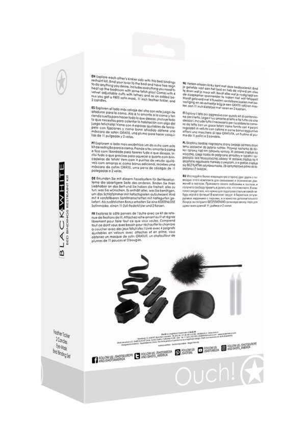Bed Bindings Restraint KitVerken elkaars kinky kant met deze bedboeienkit. Bind je geliefde vast aan het bed en heb de vrijheid om alles te doen wat je maar wilt. Bevat alles wat je nodig hebt om de slaapkamer spannender te maken met wat fetisjspel! Wordt geleverd met 4 fluwelen verstelbare boeien met bevestiging en als extraatje krijg je een GRATIS satijnen masker, een 11 inch kietelaar met veren en 2 kaarsen.
