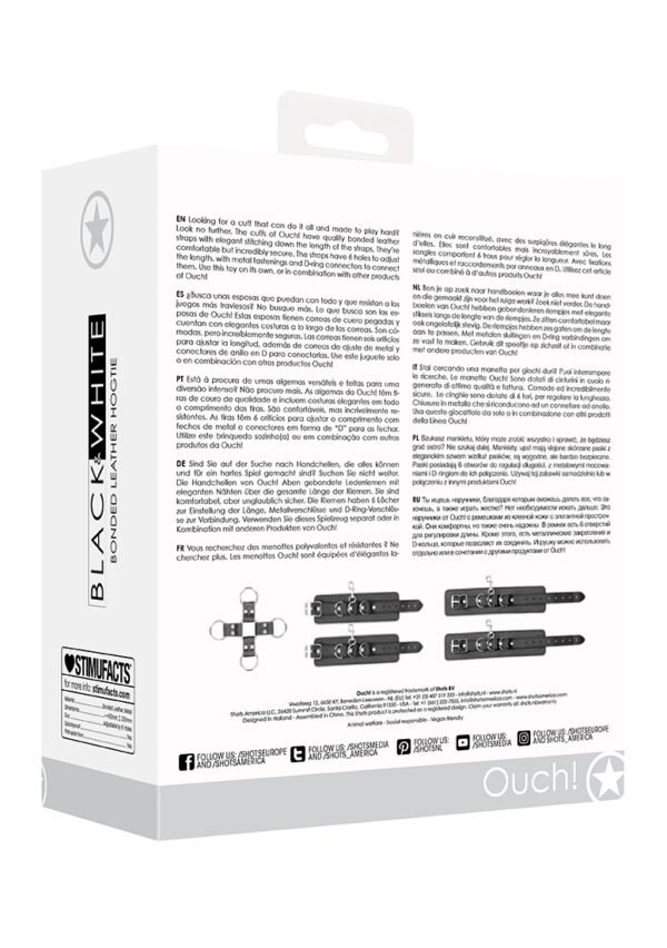 Bonded Leather Hogtie with Hand and Ankle CuffsBen je op zoek naar handboeien waar je alles mee kunt doen en die gemaakt zijn voor het ruige werk? Zoek niet verder. De handboeien van Ouch! hebben kwaliteitsleren riempjes met elegante stiksels langs de lengte van de riempjes. Ze zitten comfortabel maar ook ongelofelijk stevig. De riempjes hebben zes gaten om de lengte aan te passen. Met metalen sluitingen en D-ring verbindingen om ze vast te maken. Gebruik dit speeltje op zichzelf of in combinatie met andere producten van Ouch!