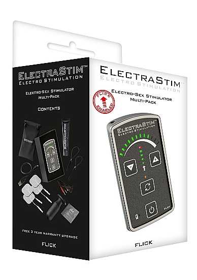 Flick – Stimulator Multi-PackHet ElectraStim Flick EM60-M pakket bevat een stimulator, alle benodigde kabels en een set van 4 ElectraPads, 2 ElectraLoops verstelbare cockringen en een siliconen Noir Aura elektrode (geschikt voor vaginaal en anaal gebruik).Een luxe slanke stimulator met leddisplay en een ergonomische bediening. Probeer de Flick-stand voor stimulatie die meedoet met een ’tikkende’ polsbeweging voor echt aanpasbare patronen.Flick-stimulators zijn perfect voor het verbeteren van masturbatie, het voorspel en seks met het spannende en uniek tintelende en pulserende van elektroseks.Kenmerken van de stimulator7 verschillende stimulatiepatronenBewegingssympathieke Flick-instelling – stimuleer met behulp van een tikkende beweging24 intensiteitniveausAfzonderlijk stimulatiekanaalUsb-oplaadbaar3 jaar garantie wanneer u uw aankoop registreertInclusiefEM60-stimulator4 geleidende pads Siliconen Noir Aura elektrode (3 inch inbrengbaar x 3,3 inch in omtrek)2 ElectraLoops cockringen (instelbaar tot 2,75 inch in diameter)Tube geleidende gel van 60 mlAansluitkabel (2mm pinaansluiting)Usb-oplaadkabelOpbergetui