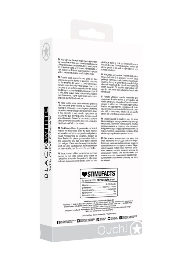 Satin Curvy Eye MaskJe kunt dit oogmasker ’s nachts gebruiken tegen het licht of je probeert hem uit op je geliefde voor een opwindende, mysterieuze ervaring. Breng je geliefde in een plezierige donkere toestand die zijn of haar seksuele lusten opwekt. Dit zachte oogmasker blijft op zijn plek door een elastiche band met klitteband.