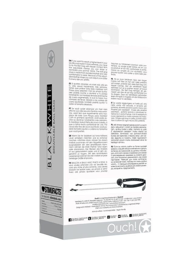 Breathable Ball Gag with Nipple ClampsAls je jouw seksleven naar een hoger niveau wilt tillen en het wat meer extreem wilt maken, probeer dan deze Ball Gag with Nipple Clamps. Met de verstelbare tepel klemmen kun je je partner teasen of totaal domineren. De Ball Gag riempjes zijn gemaakt van leer en zijn erg comfortabel om te dragen. Door de verstelbare leren riempjes is mogelijk om de halsband in iedere maat te verstellen.