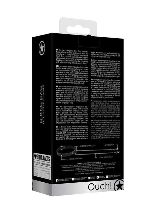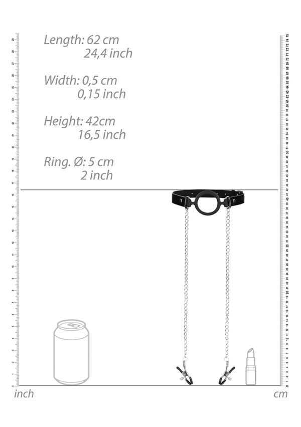 O-Ring Ball Gag with Nipple ClampsDeze hypoallergene Ring Gag is gemaakt van fluweelzacht siliconen en wordt geleverd met een verstelbare (met 9 verschillende standen) PU-leren riem die de meeste mensen prettig zal passen. De gecoate tepelklemmen met schroefpennen laten je de spanning opbouwen en worden aan de Ring Gag bevestigd met voldoende lange (35 cm) metalen kettingen