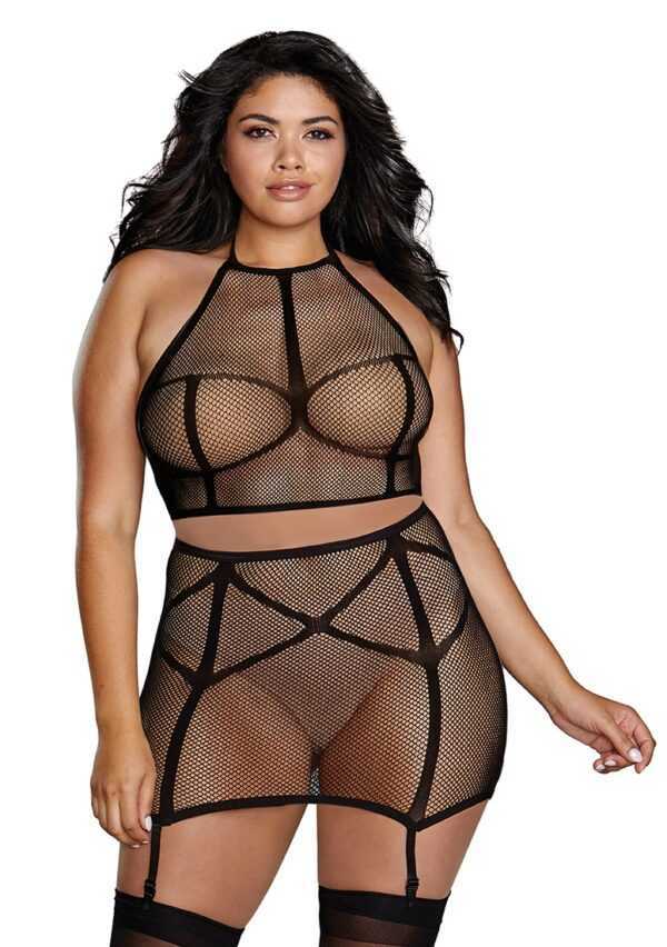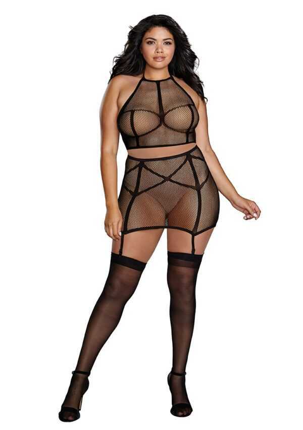 Seamless Fishnet Two Piece Set – Plus SizeNaadloze visnet tweedelige set. Halter bralette met gebreide stijl lijn bh details. Verstelbare striksluiting in de nek. Hoge taille kousenband rok met gebreide kousenband details. Vastgemaakte verstelbare kousenbanden. String niet inbegrepen.