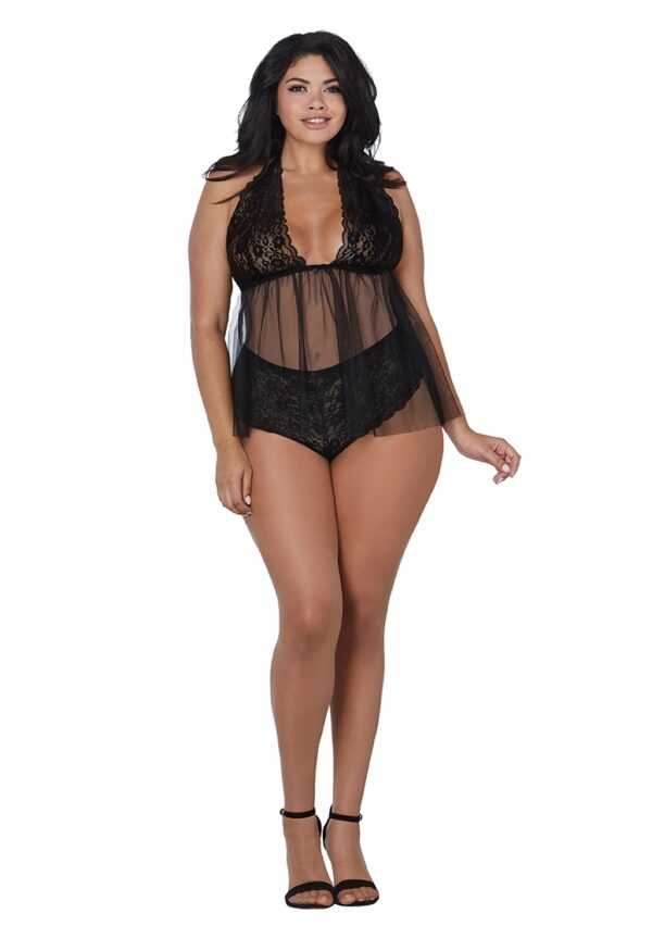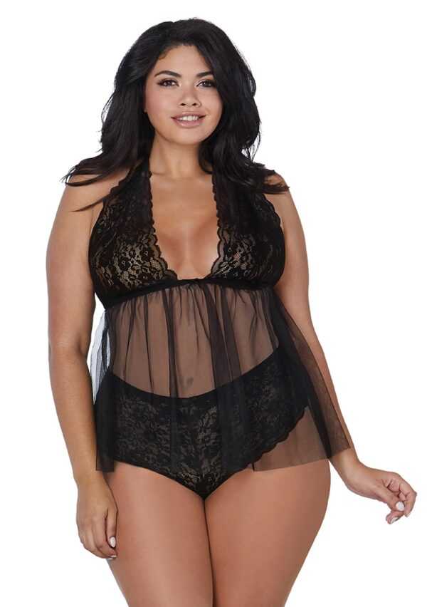 Retro, Lace and Mesh Halter Babydoll – Plus Size