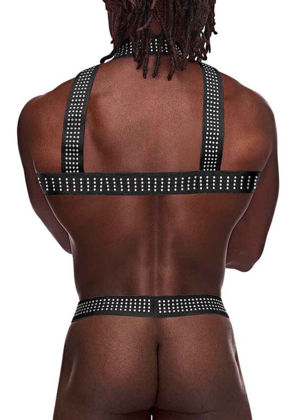 Elastic Harness with Studs – One Size – BlackDeze stijl komt uit de Elastic Harness-collectie van Male Power en bestaat uit: een harnas met banden die zijn afgezet met metalen studs, verstelbare metalen clips en een afneembare tailleband met een afneembare siliconen rubberen cockring.