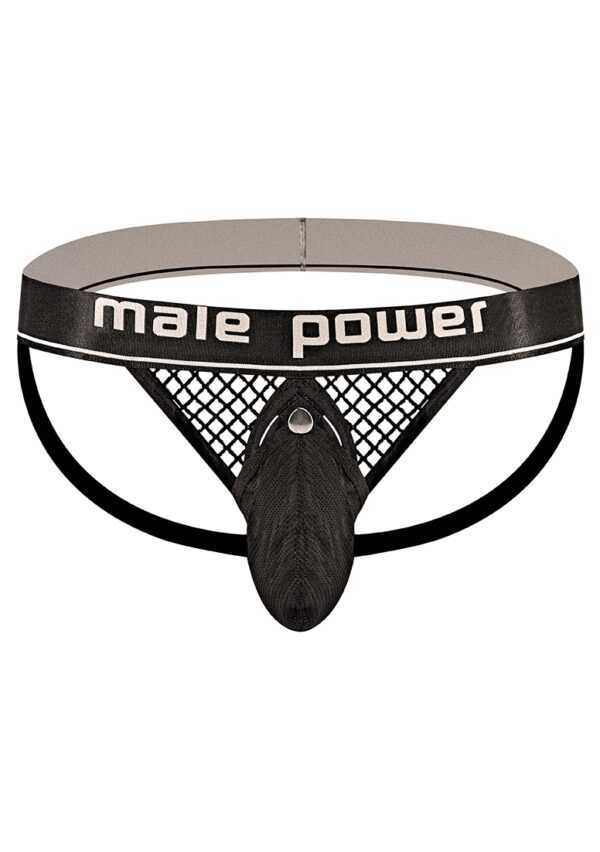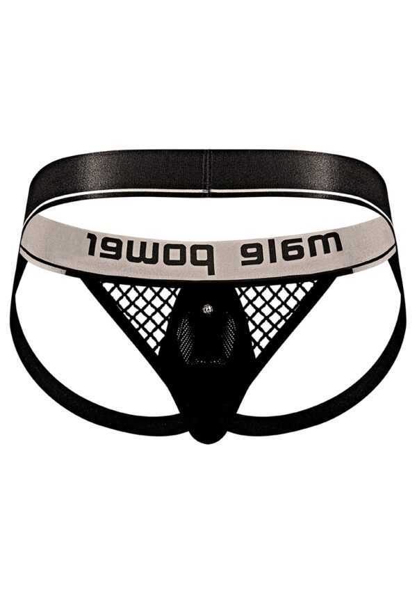 Cock Ring Jock – S/M – BlackDeze stijl komt uit de Cock Pit Net-collectie van Male Power en bestaat uit: een Cock Ring Jock met een afneembaar zakje met drukknoopsluiting, een zachte elastische C-ring, zachte elastische beenbanden en afwerking en een satijnen tailleband met merklogo.