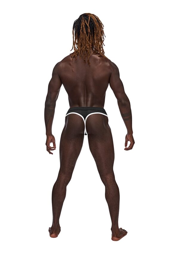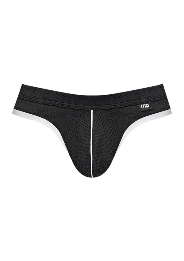 Sport Mesh Thong – S/MUit de Sport Mesh-collectie van Male Power, de Sport Thong, heeft een tailleband met stoffen bekleding die goed blijft zitten en een MP-tag met logo. Pluche elastaan sportieve strepen accentueren de voorkant en een t-back van 2,5 cm aan de achterkant.