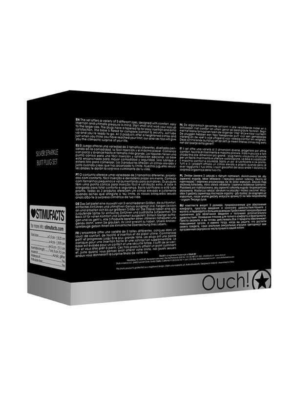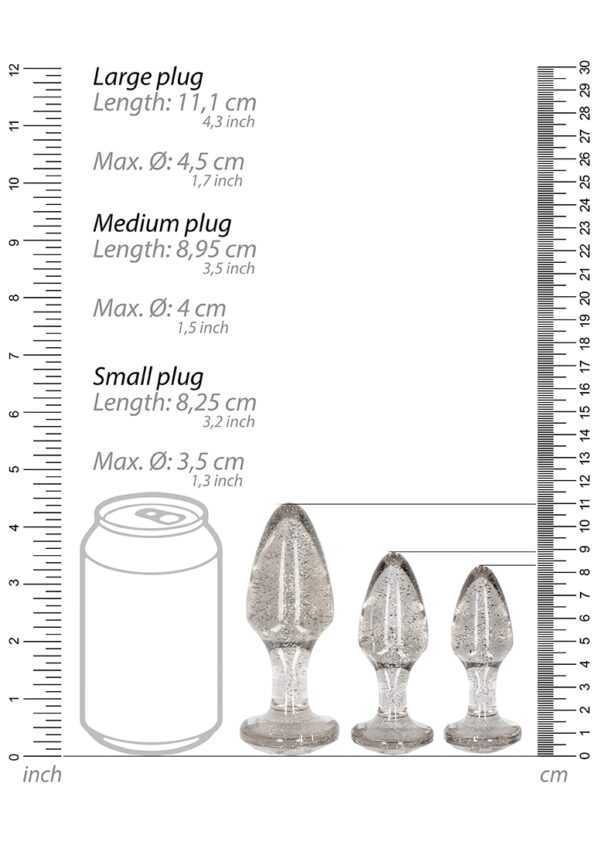 Acrylic Butt Plug SetAls opwindende anale seks jouw ding is dan zal deze sprankelende buttplug set je zeker niet teleurstellen! De ergonomisch gevormde set komt in drie verschillende maten en is ontworpen met comfort en ultiem genot als belangrijkste factoren. Ontspan en geniet van deze gemakkelijk inbrengbare pluggen alleen of samen met je partner! Deze glinsterende set heeft alles wat je nodig hebt voor uren aan anaal plezier. Begin met het kleine formaat en neem de volgende ?stap? als je er klaar voor bent! De pluggen hebben een taps toelopende punt voor een gemakkelijke inbreng en de voet is wijd uitlopend voor volledig comfort en veiligheid. Deze schitterende buttplug set zal zelfs je meest intense climax nog eens net dat beetje extra geven!