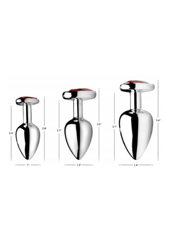 Red Heart – Butt Plug SetVersier je derriere met dit trio van Ruby Anal Hearts! Ze gaan van klein naar groot om het voor alle anale vaardigheidsniveaus gemakkelijk te maken om van deze zware, metalen lekkernijen te genieten. Voeg een robijnrode flits toe aan je kont tijdens het voorspel als warming-up voor het anale hoofdevenement, of gewoon als een visuele teaser voor je geliefde om van te genieten terwijl je voorover buigt!Begin met de kleinste Ruby Heart anaal plug en werk je weg naar medium en groot als je voelt dat je achterdeur klaar is. Dit drietal kan zijn solo gebruikt om je anale horizon te verruimen, of deel een plug met je partner en geniet van dubbel penetratieplezier! Gebouwd met een zware aluminiumlegering, waardoor deze robijnrode pluggen een zwaar, glad en duurzaam gevoel hebben. Geschikt voor temperatuurspel – gewoon opwarmen of afkoelen in een kom met water om nog een laag anale sensatie toe te voegen terwijl je inbrengt! Elke plug is bevredigend moeilijk om een bevredigende massa te leveren voor je kont om op te knijpen, compatibel met alle soorten smeermiddelen.