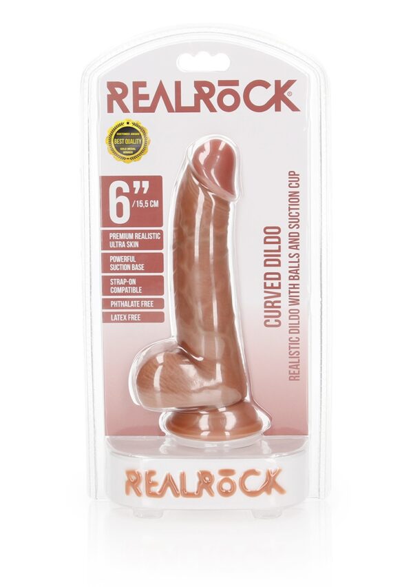 Curved Realistic Dildo with Balls and Suction Cup – 6 / 15,5 cmRealRock is ontworpen voor jouw ultieme genot. Een stevige en zacht aanvoelende dildo, met een natuurlijk uiterlijk en precies de juiste maat. Dit alles in combinatie met de realistische aders op de schacht voor extra stimulatie van binnen, zorgen ervoor dat je deze dildo niet snel zult vergeten in je nachtkastje. Deze realistische dildo is licht gebogen, wat hem ideaal maakt voor g-spot stimulatie. Geniet van dit model van binnen en van buiten! Door details het scrotum en goedgevormde eikel is het gebruik van deze dildo levensecht. De zuignap maakt stevig handsfree gebruik mogelijk (op een gladde ondergrond) en biedt tevens de mogelijkheid om deze RealRock in een harnas te gebruiken. Met al deze opties zul je een explosief orgasme hebben dat aan niets zal ontbreken.
