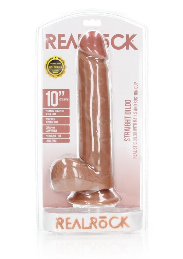 Straight Realistic Dildo with Balls and Suction Cup – 10 / 25,5 cmRealRock is ontworpen voor jouw ultieme genot. Een stevige en zacht aanvoelende dildo, met een natuurlijk uiterlijk en precies de juiste maat. Dit alles in combinatie met de realistische aders op de schacht voor extra stimulatie van binnen, zorgen ervoor dat je deze dildo niet snel zult vergeten in je nachtkastje. Deze realistische dildo perfect recht voor diepe penetratie. Door details het scrotum en goedgevormde eikel is het gebruik van deze dildo levensecht. De zuignap maakt stevig handsfree gebruik mogelijk (op een gladde ondergrond) en biedt tevens de mogelijkheid om deze RealRock in een harnas te gebruiken. Met al deze opties zul je een explosief orgasme hebben dat aan niets zal ontbreken.