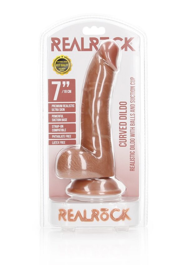 Curved Realistic Dildo with Balls and Suction Cup – 7 / 18 cmRealRock is ontworpen voor jouw ultieme genot. Een stevige en zacht aanvoelende dildo, met een natuurlijk uiterlijk en precies de juiste maat. Dit alles in combinatie met de realistische aders op de schacht voor extra stimulatie van binnen, zorgen ervoor dat je deze dildo niet snel zult vergeten in je nachtkastje. Deze realistische dildo is licht gebogen, wat hem ideaal maakt voor g-spot stimulatie. Geniet van dit model van binnen en van buiten! Door details het scrotum en goedgevormde eikel is het gebruik van deze dildo levensecht. De zuignap maakt stevig handsfree gebruik mogelijk (op een gladde ondergrond) en biedt tevens de mogelijkheid om deze RealRock in een harnas te gebruiken. Met al deze opties zul je een explosief orgasme hebben dat aan niets zal ontbreken.