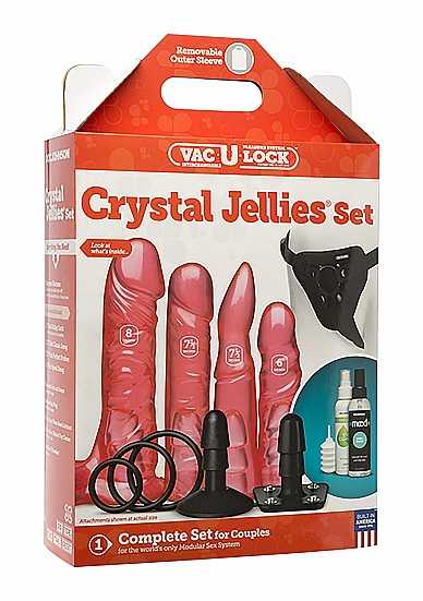 Crystal Jellies SetJe perfecte strap-on-ervaring staat vast met de luxe lijn van full-service Vac-U-Lock-harnassets van Doc Johnson. Een uitbarsting van kleur laat je speeltijd knallen met de Vac-U-Lock Crystal Jellies-set. Met deze luxe voorbindset kun je in een handomdraai spelen met een compleet harnas inclusief verwijderbare o-ringen en de gepatenteerde Vac-U-plug, vier verschillende en opwindende Crystal Jellies Vac-U-Lock-bevestigingen in doorschijnend roze en een fles met Mood glijmiddel op waterbasis. Hulpstukken kunnen worden gebruikt met het harnas, de meegeleverde Vac-U-Lock-zuignap en elk ander accessoire of harnas in de lijn. De Vac-U-Lock Crystal Jellies-set bevat ook Doc Johnson Natural Toy Cleaner en ULTRASKYN Refresh Powder om uw ULTRASKYN-hulpstukken met dubbele dichtheid goed en hygienisch te onderhouden. Elk product in het gepatenteerde Vac-U-Lock-systeem is ontworpen om u te helpen bij het maken van een strap-on of speeltje waar u zin in heeft, en het is zo simpel als het ophangen van het hulpstuk van uw keuze.