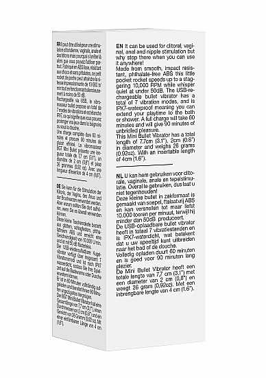 10 Speed Rechargeable BulletU kan hem gebruiken voor clito- rale, vaginale, anale en tepelstimu- latie. Overal te gebruiken, dus laat u niet tegenhouden!Deze kleine bullet in zakformaat is gemaakt van soepel, ftalaatvrij ABS en kan versnellen tot maar liefst 10.000 toeren per minuut, terwijl hij minder dan 50dB produceert.De USB-oplaadbare bullet vibrator heeft in totaal 10 vibratiestanden en is IPX7-waterdicht, wat betekent dat u uw speeltijd kunt uitbreiden naar het bad of de douche. Volledig opladen duurt 60 minuten en is goed voor 90 minuten lang plezier.De Mini Bullet Vibrator heeft een totale lengte van 7,7 cm (3,1) met een diameter van 2 cm (0,8) en weegt 26 gram (0,92oz). Met een inbrengbare lengte van 4 cm (1.6).