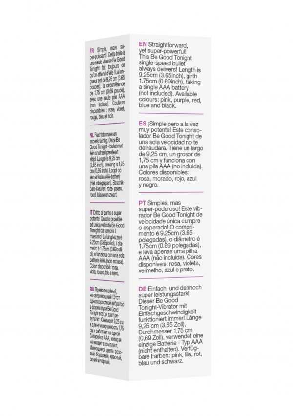 1 Speed Bullet – PurpleRechtdoorzee en superkrachtig. Deze Be Good Tonight – bullet met een snelheid presteert altijd. Lengte is 9,3 cm (3,7 inch), omvang is 1,8cm (0,7 inch). Loopt op een enkele AAA-batterij(niet inbegrepen). Beschikbare kleuren: roze, paars,rood, blauw en zwart.