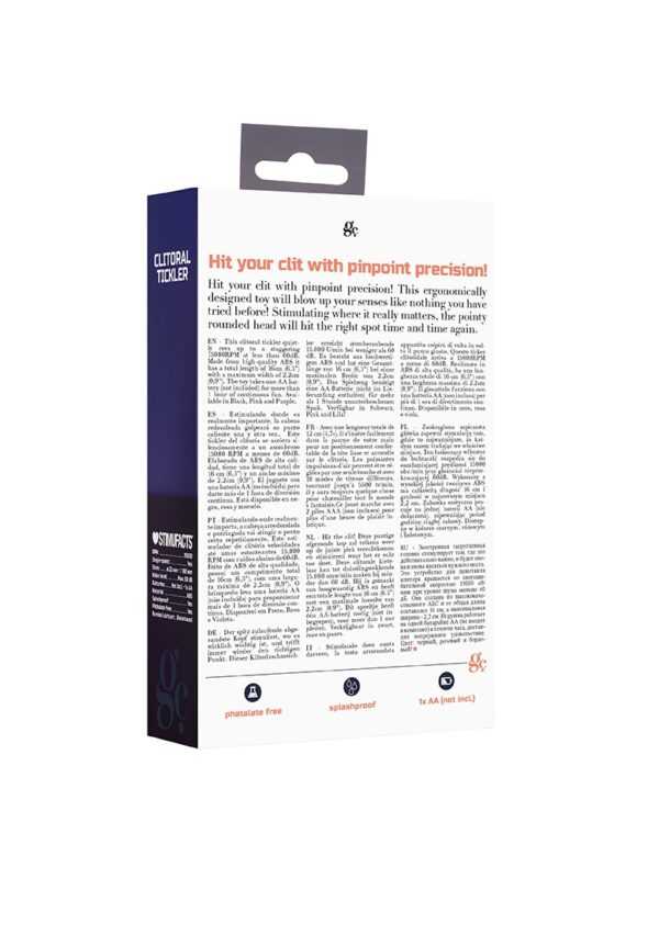 Clitoral TicklerHit the clit! Deze puntige afgeronde kop zal telkens weer op de juiste plek terechtkomen en stimuleren waar het er echt toe doet. Deze clitorale kietelaar kan tot duizelingwekkende 15.000 omwmin maken bij minder dan 60 dB. Hij is gemaakt van hoogwaardig ABS en heeft een totale lengte van 16 cm (6.3?) met een maximale breedte van 2.5cm (0.9?). Dit speeltje heeft een AA-batterij nodig (niet inbegrepen), voor meer dan 1 uur plezier. Verkrijgbaar in zwart, roze en paars.